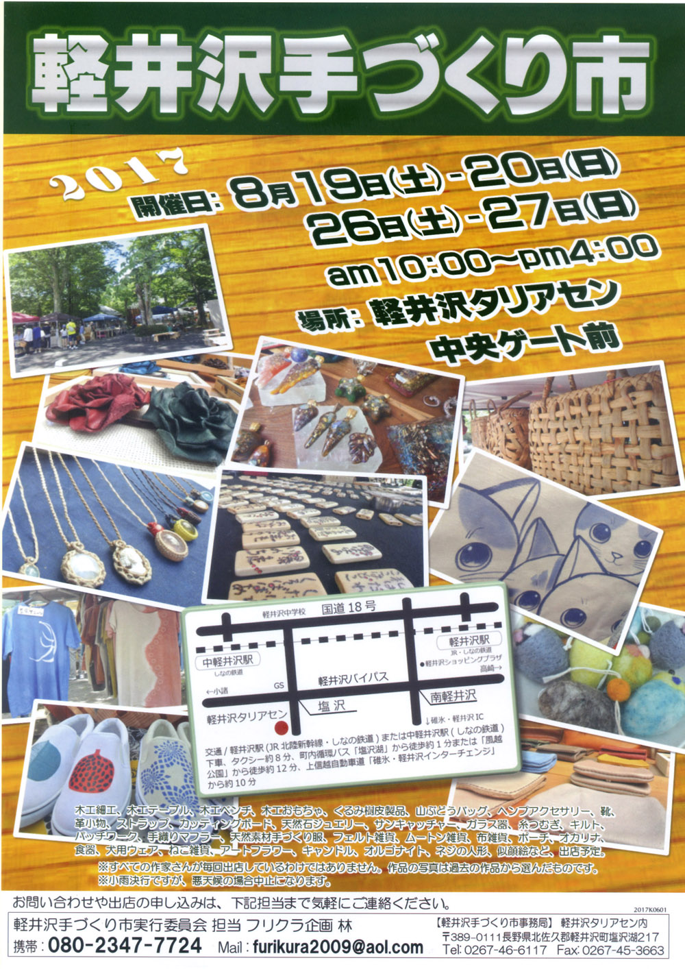 日時:2017年8月19日(土)、20日(日)、26日(土)、27日(日)10:00〜16:00 場所:軽井沢タリアセン 中央ゲート前 料金:軽井沢タリアセン入園料不要ですがお車でお越しの場合駐車料金500円