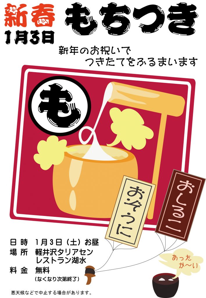 つきたてのお餅でお汁粉やお雑煮など振舞います。約200食無料。