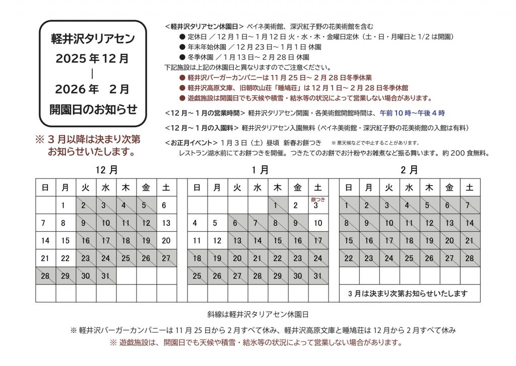 ●軽井沢タリアセン休園日 (ペイネ美術館、深沢紅子野の花美術館を含む)
