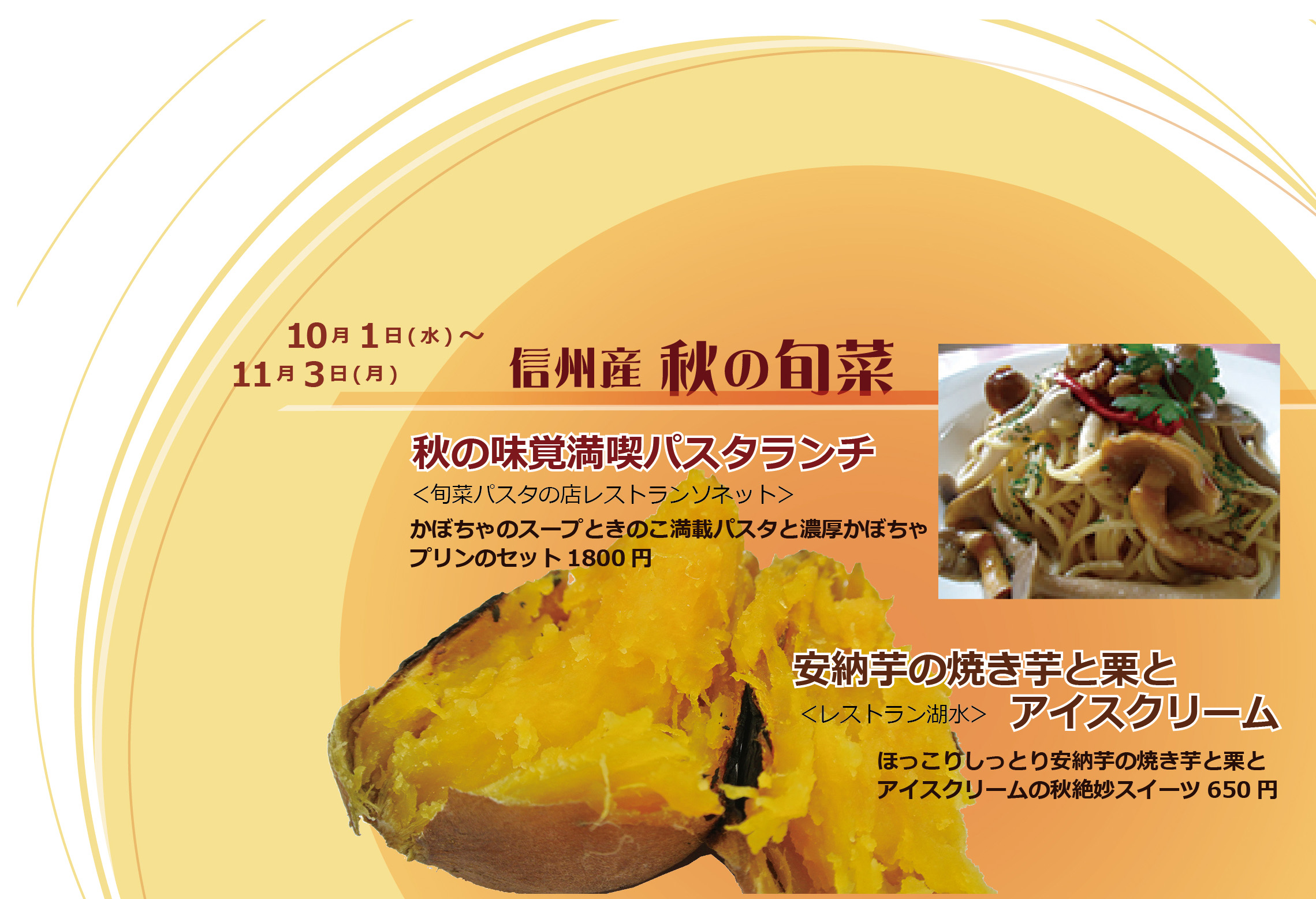 安納芋の焼き芋と栗とアイスクリーム ほっこりしっとり安納芋の焼き芋と栗とアイスクリームの秋絶妙スイーツ 料金 650円 場所 レストラン湖水 秋の味覚満喫パスタランチ かぼちゃのスープときのこ満載パスタと濃厚かぼちゃプリンのセット 料金 1800円 場所 旬菜パスタの店 レストランソネット