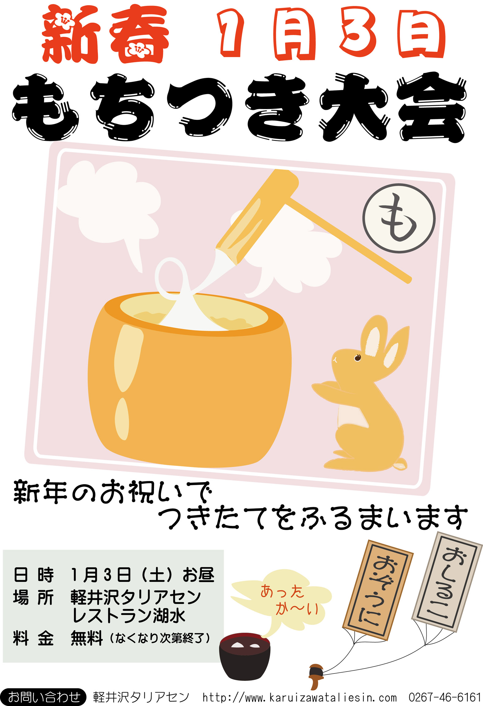 レストラン湖水前にてお餅つき開催、つきたてのお餅でお汁粉やお雑煮など無料提供 (200食限定)